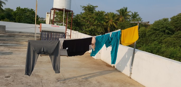 Lördag morgon var det dags att packa och ge oss av hemåt. Nu kändes resan lugn och fin även om det var väldigt trångt på sina platser. Allt som allt gick resan utan missöden och vi kom tillbaka till Trichy vid tretiden. Då hade värmen slagit till och det var 38 grader. En kall dusch skulle sitta fint men det fanns bara varmvatten… Riktigt hett vatten. Det finns en vattencistern på taket som värms upp av solen och när det är 40 grader varmt blir vattnet ännu varmare. Det finns bara en vattenledningen så man får vara glad för det vattnet man får. Det var även skönt att få tvätta lite svettiga kläder. När jag hängde dem på taket torkade de på nolltid.