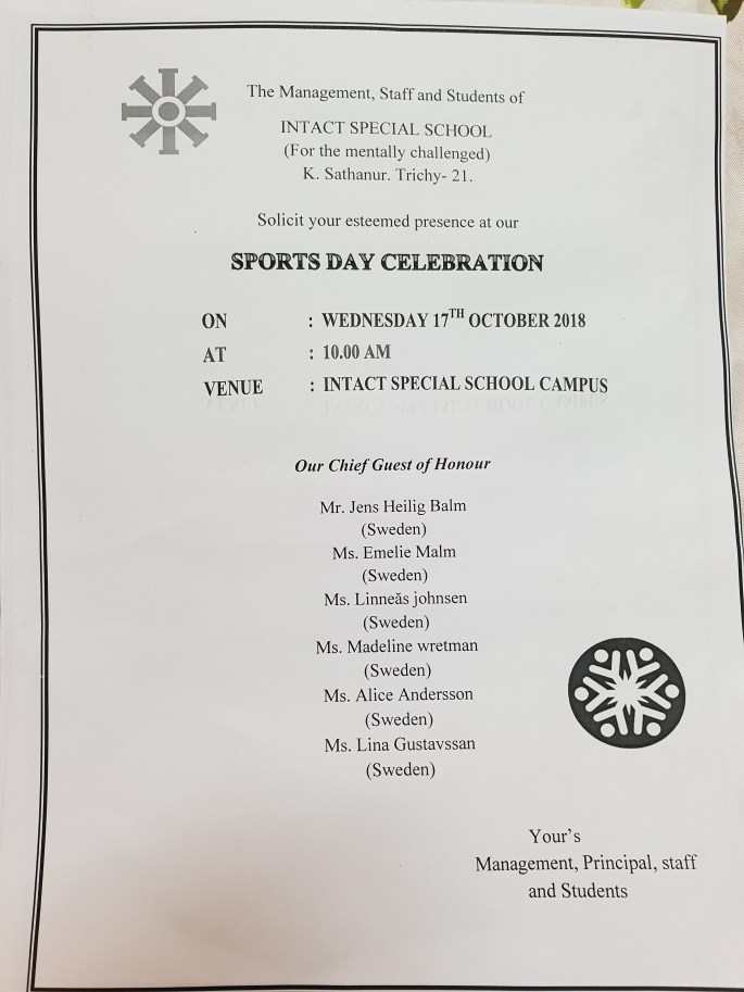 Som en del av er vet så befinner vi (Lina, Alice, Jens, Linnea, Emelie & Madeleine) oss på Intact Special School i södra Indien och gör fältstudier. Intact Special School är ett utav flera projekt som Intact jobbar med i dagsläget. Ni kan läsa mer om de olika projekten på http://www.intactindia.org . Vi har nu varit här i ett par veckor och kan bekräfta att detta är en organisation som är bra. Här görs skillnad varje dag! Intact är dock en organisation som finansieras och drivs genom donationer utav olika slag. Exempelvis genom Intacts vänner. Vi har nu tänkt att starta en insamling där pengarna kommer gå oavkortat till verksamheten. Med tanke på den indiska Rupeens värde gentemot den svenska kronan kan en liten summa i kronor göra en stor skillnad här.