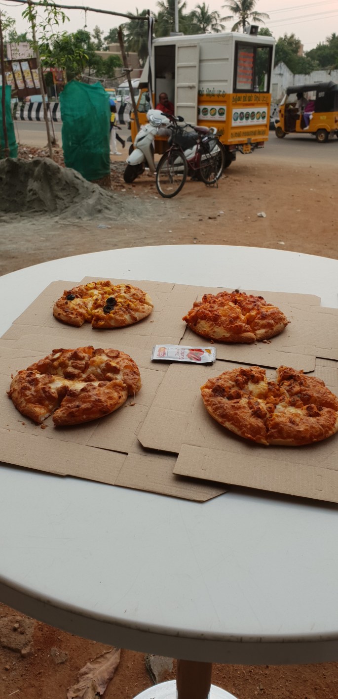 Vi har stått i smutsen bredvid vägen och ätit pizza.